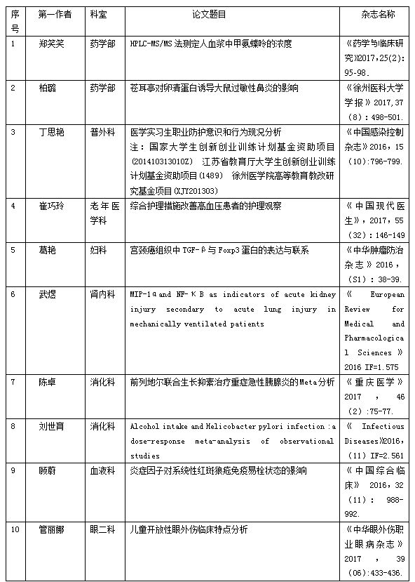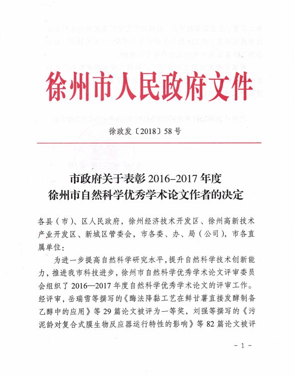 根據(jù)徐州市人民政府文件《市政府關(guān)于表彰2016-2017年度徐州市自然科學(xué)優(yōu)秀學(xué)術(shù)論文作者的決定》(徐政發(fā)[2018]58號),徐州市第一人民醫(yī)院2018年獲得15項市政府自然科學(xué)優(yōu)秀學(xué)術(shù)論文獎。