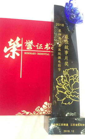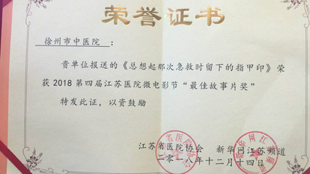 2018年12月14日晚,由江蘇省醫(yī)院協(xié)會、新華網(wǎng)江蘇有限公司聯(lián)合舉辦的“第四屆江蘇醫(yī)院微電影節(jié)”頒獎典禮在江蘇泰州舉行。徐州市中醫(yī)院參選的微電影《總想起那次急救時留下的指甲印》,以真實感人的故事情節(jié)為藍(lán)本,描繪了醫(yī)護(hù)人員“生命重于泰山”的工作信念和快速高效的執(zhí)行力,在眾多的選送作品中脫穎而出,獲得了“最佳故事片獎”這一分量極重的獎項。