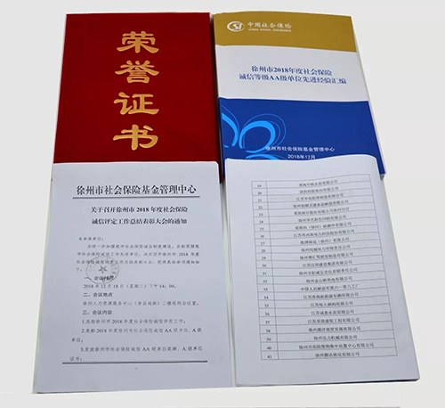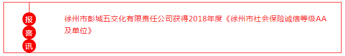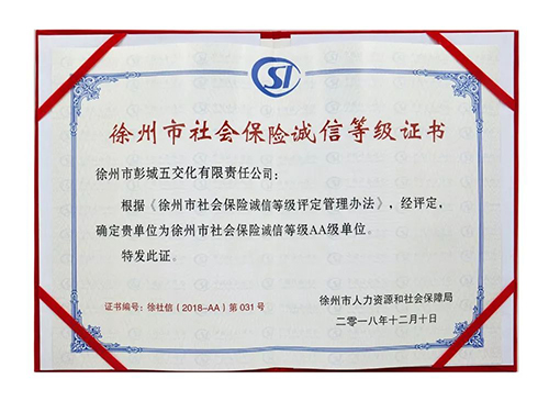 徐州市彭城五交化有限責(zé)任公司獲得2018年度《徐州市社會(huì)保險(xiǎn)誠(chéng)信等級(jí)AA及單位》
