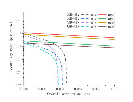 隨著量子密鑰分發(fā)系統(tǒng)速率不斷提高,單光子探測器的后脈沖效應(yīng)將顯著增強(qiáng)。后脈沖是指探測器中的雪崩光電二極管在發(fā)生雪崩之后,一段時間內(nèi)隨機(jī)產(chǎn)生二次雪崩的現(xiàn)象。過去忽略后脈沖效應(yīng)的模型需要修正:一方面后脈沖會在系統(tǒng)中引入更多的錯誤響應(yīng),另一方面系統(tǒng)參數(shù)的優(yōu)化可有效提高安全密鑰生成率。因此,韓正甫研究組基于自身多年來對探測器的深入研究,利用后脈沖過程的非馬爾科夫特性,提出了新的模型。該模型將高階后脈沖考慮在內(nèi),給出了新的計(jì)數(shù)率和誤碼率的計(jì)算方法,顯著提升了高速實(shí)用化系統(tǒng)的核心性能指標(biāo)。