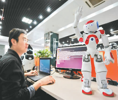 科大訊飛智能機器人工程師對機器人“小柔”進行聲學(xué)視覺等方面的系統(tǒng)集成。