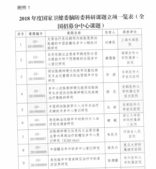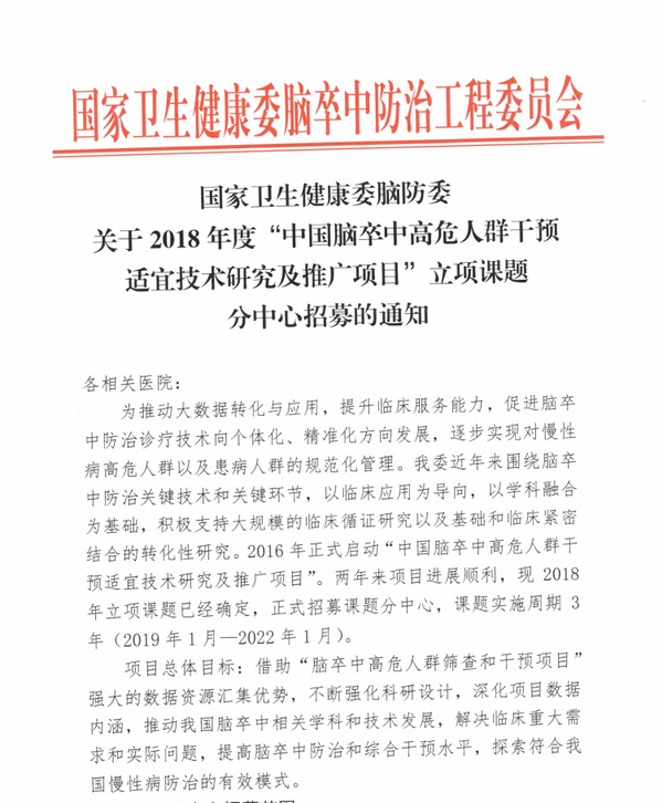 我院神經(jīng)內(nèi)科科主任耿德勤教授作為國家衛(wèi)健委腦卒中防治專家委員會(huì)委員,積極參與腦防委各項(xiàng)科研、項(xiàng)目工作,為我國卒中防控工程獻(xiàn)計(jì)獻(xiàn)策。經(jīng)過多輪角逐競爭,耿德勤教授題為《急性腦卒中患者降壓治療中的真實(shí)世界研究》(課題編號(hào)GN-2018R0009)成功入選國家腦防委“中國腦卒中高危人群干預(yù)適宜技術(shù)研究及推廣項(xiàng)目”立項(xiàng)課題,目前此課題正在針對(duì)腦防委高危人群篩查和干預(yù)項(xiàng)目醫(yī)院公開招募中。