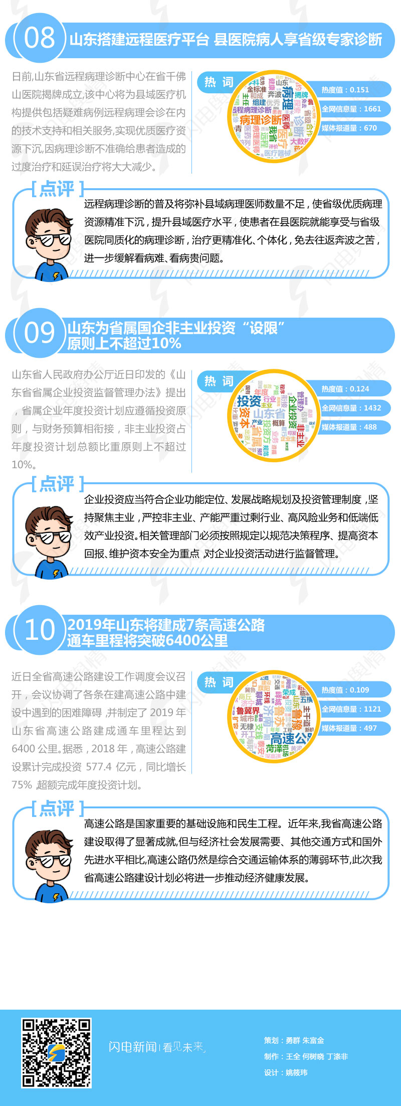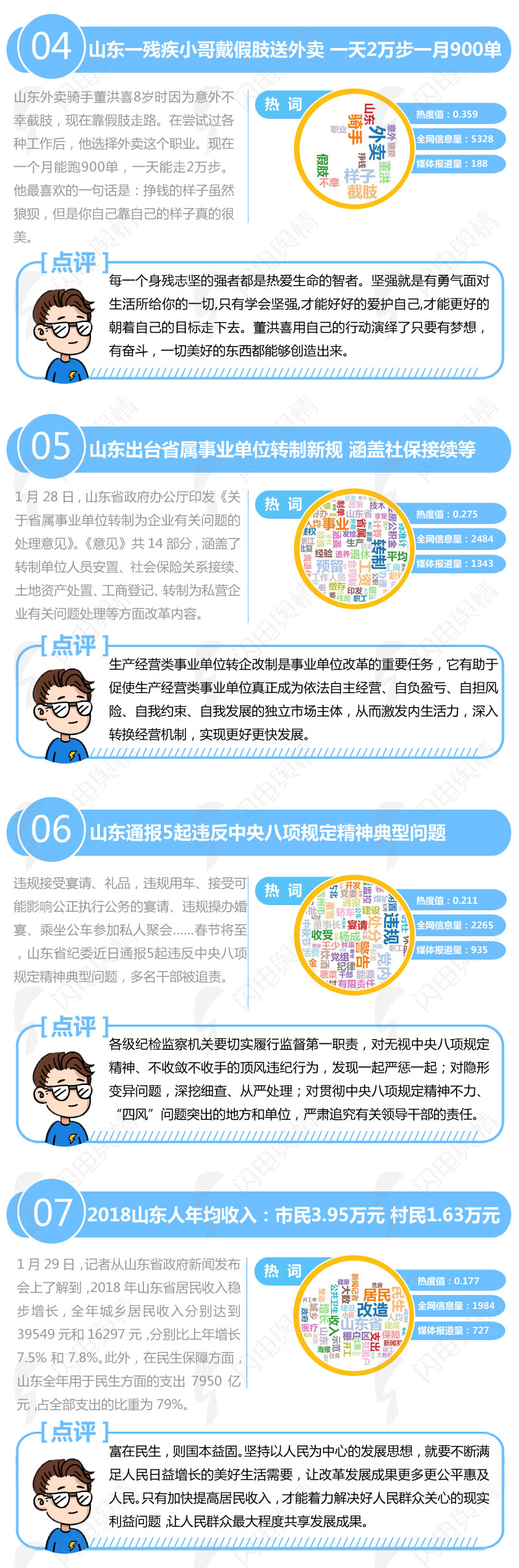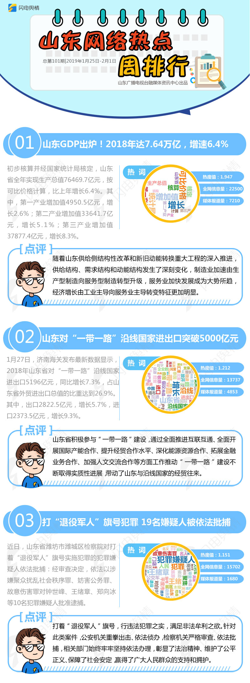 齊魯網(wǎng)2月1日訊 “山東網(wǎng)絡(luò)熱點(diǎn)周排行”第一百零一期出爐。通過對(duì)2019年1月25日-2月1日周期內(nèi)涉及山東的網(wǎng)上信息進(jìn)行監(jiān)測(cè)、計(jì)算和分析得出結(jié)果。通過監(jiān)測(cè)統(tǒng)計(jì)發(fā)現(xiàn),本周山東網(wǎng)絡(luò)熱點(diǎn)事件涉及經(jīng)濟(jì)增長(zhǎng)、醫(yī)療等方面。本周有哪些熱點(diǎn)事件最受網(wǎng)友關(guān)注?記者用數(shù)據(jù)解讀本周山東網(wǎng)絡(luò)熱點(diǎn)。