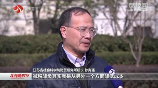 江蘇省社會(huì)科學(xué)院財(cái)貿(mào)研究所所長(zhǎng)孫克強(qiáng):“減稅降負(fù),其實(shí)就是從另外一個(gè)方面降低成本,就擴(kuò)大了企業(yè)盈利的空間,真正解決企業(yè)發(fā)展的后顧之憂,在創(chuàng)新發(fā)展、轉(zhuǎn)型發(fā)展過(guò)程當(dāng)中,把江蘇實(shí)體經(jīng)濟(jì)的優(yōu)勢(shì)進(jìn)一步發(fā)揮出來(lái),做大做強(qiáng)。”