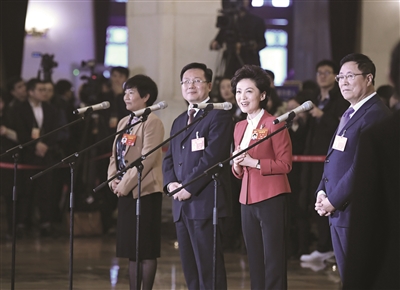 全國政協(xié)委員在“委員通道”接受采訪。新華社 發(fā)