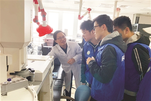 徐州工程學院大學生志愿者和社區(qū)居民代表,在實驗室內(nèi)參觀監(jiān)測儀器設備。