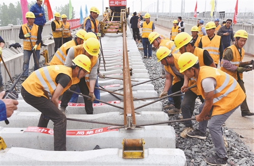 中鐵十一局集團徐宿淮鹽鐵路五標指揮部副指揮長蘇玉明介紹說,徐宿淮鹽鐵路全線采用500米長鋼軌鋪設,按一次性鋪設、跨區(qū)間無縫線路設計,長軌鋪設完成后還需進行道砟上線、大機搗固、焊軌及應力放散鎖定、線路精調以及線路精搗等作業(yè),確保軌面平順度標高控制在0.2毫米,提高了線路的平順性,確保高速列車的行駛安全,讓旅客乘坐更加平穩(wěn)舒適。
