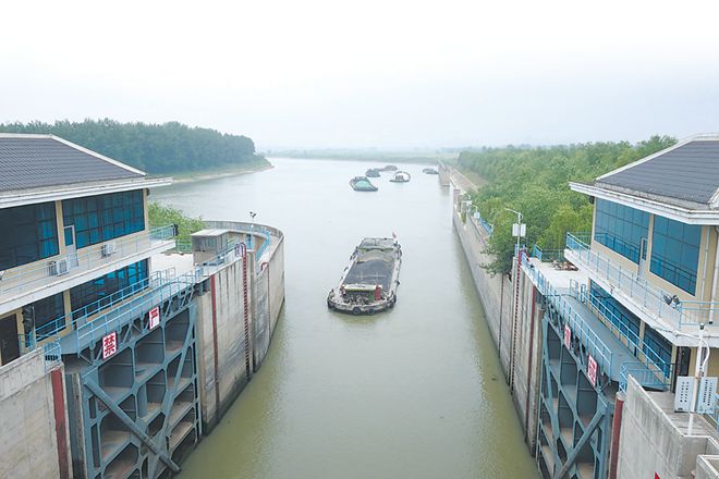5月15日,從蘇浙滬駛來的貨運船只在淮河干流蚌埠閘新船閘有序過閘,駛向淮河上游。葉勝利 熊志剛 攝  4月下旬" />