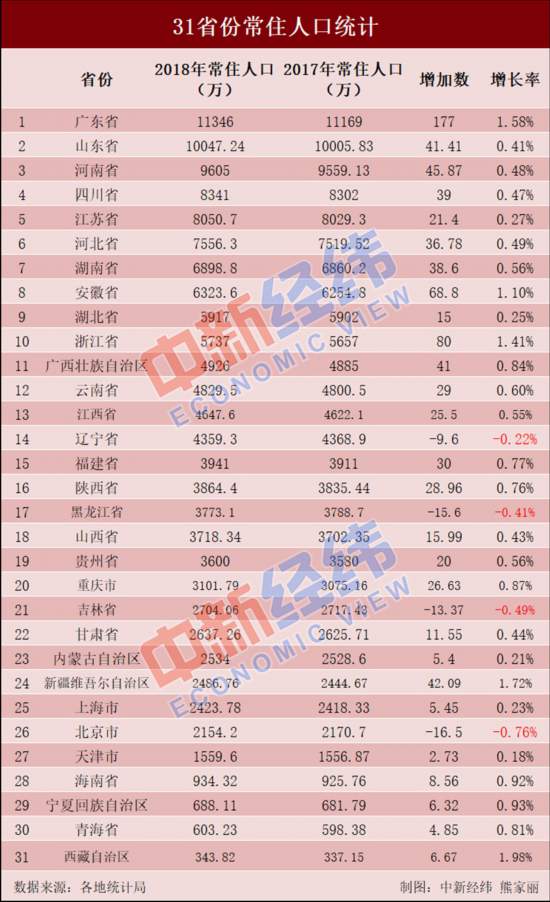 隨著中國各地2018年國民經濟和社會發(fā)展統(tǒng)計公報陸續(xù)公布,31省區(qū)市常住人口數(shù)據(jù)全部揭曉。截至去年末,廣東、山東兩省常住人口數(shù)量領先全國,雙雙突破一億大關。