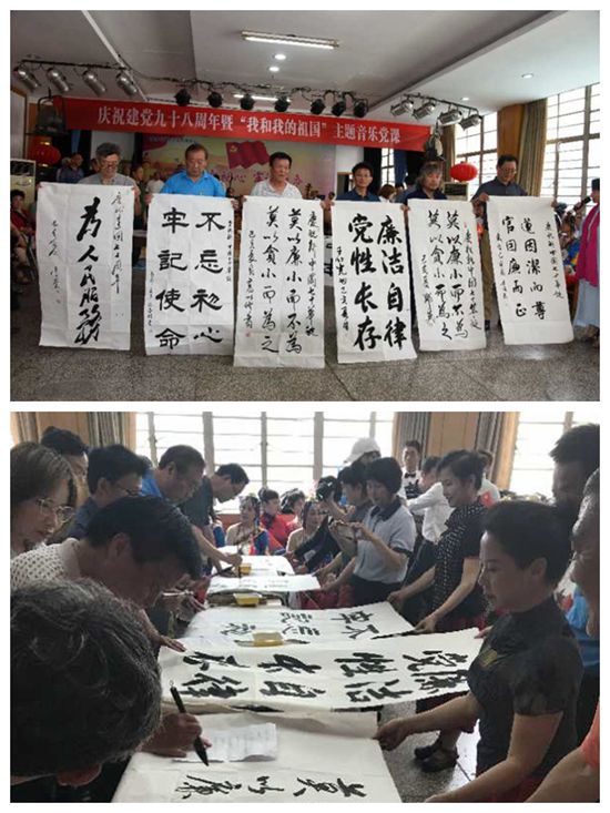 書法家們現(xiàn)場揮毫潑墨,“為人民服務(wù)”、“不忘初心、牢記使命”、“廉潔自律、黨性長存”……寫出了黨員們的心聲。