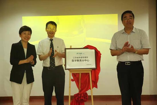 會(huì)議現(xiàn)場(chǎng),王人顥教授、鄭婷女士和朱孝成教授共同為“江蘇省體重管理學(xué)醫(yī)學(xué)教育分中心”揭牌。
