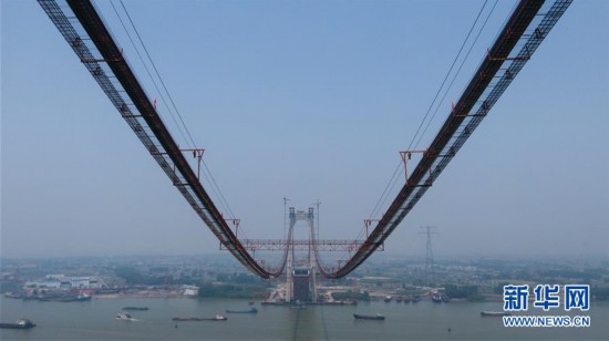 圖為5月10日在江蘇鎮(zhèn)江拍攝的建設中的連鎮(zhèn)鐵路五峰山長江大橋(無人機拍攝)。當日,連(云港)鎮(zhèn)(江)鐵路五峰山長江大橋704根主纜索股全部架設到位,標志著我國首座公鐵兩用懸索橋主纜架設完成。 新華社記者 李響 攝