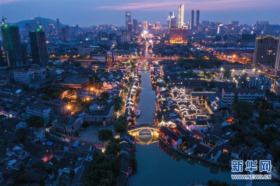 這是6月12日無人機拍攝的大運河無錫段的清名橋歷史文化街區(qū)夜景。 新華社記者李博攝