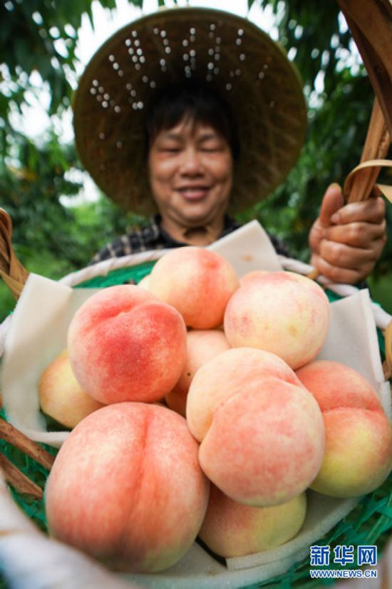 7月16日,在無錫市陽山鎮(zhèn)桃源村大路頭水蜜桃專業(yè)合作社,農戶展示采摘的水蜜桃。新華社記者 李博攝