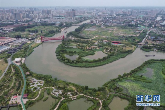 無人機拍攝的揚州三灣運河公園周邊的古運河景色(6月17日攝)。新華社記者 季春鵬 攝