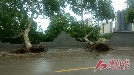 ▲受臺風影響,沛縣城區(qū)出現(xiàn)樹木被吹歪的情況。