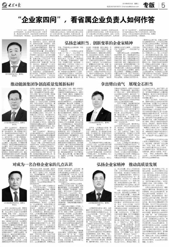 近日,山東省國資委專門組織省屬企業(yè)開展了討論回答活動,組織專題座談會,引導企業(yè)家進行認真思考和回答。8月20日,大眾日報刊發(fā)整版文章,對5名省屬企業(yè)負責人結合自身企業(yè)實際和“掌門”經歷回答的“四問”進行報道。