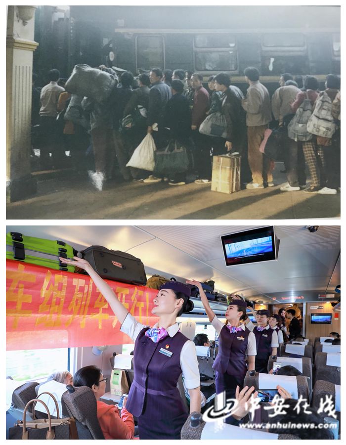 上圖:改革開放初,停在合肥站的綠皮車。“那時候秩序不太好,爬車窗的情況比比皆是。”胡朝新說。下圖:復(fù)興號動車組的乘務(wù)員們將帶著旅客們練習(xí)“高鐵健身操”。