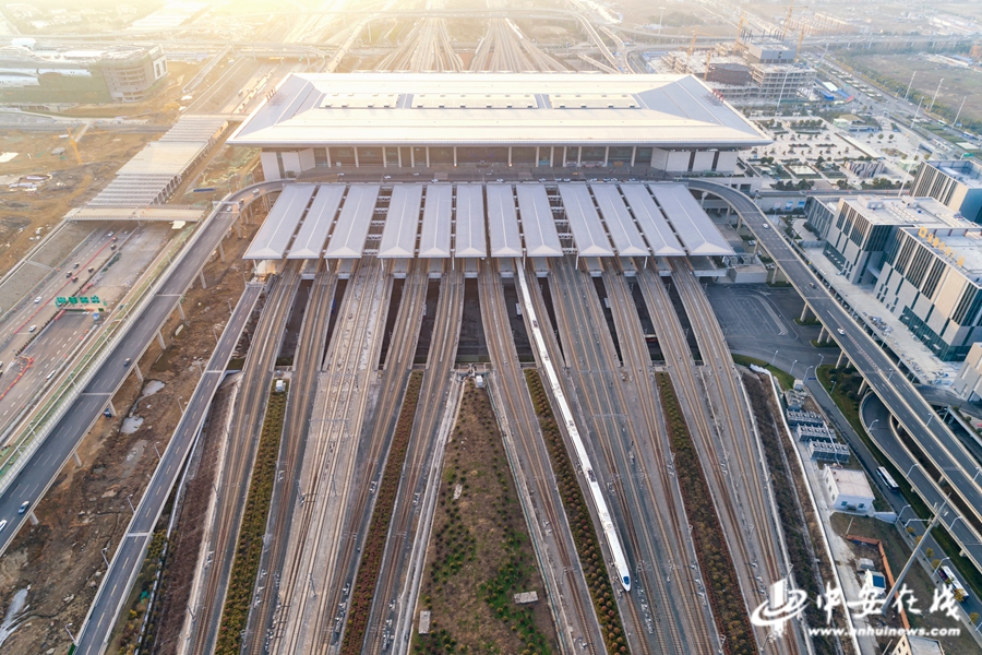 2014年11月12日合肥南站開通運營。新建的合肥南站采取“五岳朝天、四水歸堂”徽派建筑設(shè)計風(fēng)格,站房面積9.93萬平方,設(shè)計最高集聚旅客9500人。站場設(shè)有滬漢蓉、合福2場,共22站臺26股道,雨棚面積61280平方;車站采取“上進(jìn)下出、平進(jìn)平出”的立體客流流線設(shè)計模式,地上的兩層為高鐵進(jìn)站層,地下的三層為城市交通層,共有91部自動扶梯,32部垂直電梯以實現(xiàn)站內(nèi)快速交通。