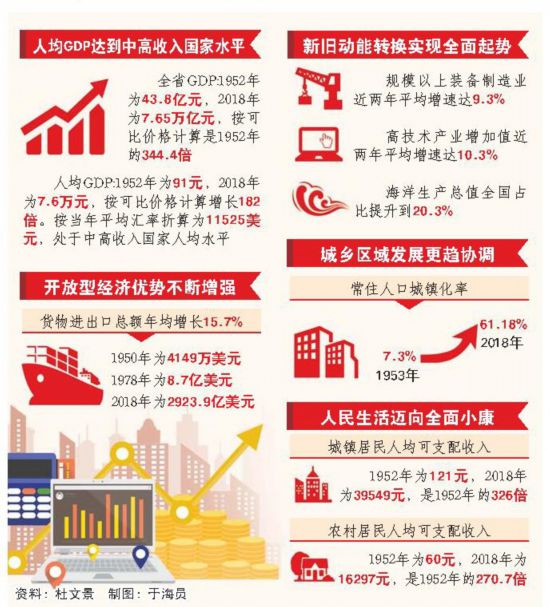 全省生產(chǎn)總值由1952年的43.8億元提升到2018年的7.65萬億元,按可比價(jià)格計(jì)算是1952年的344.4倍;現(xiàn)在山東省1天創(chuàng)造的財(cái)富量,相當(dāng)于1952年全年的4.8倍……70年櫛風(fēng)沐雨,在中國(guó)共產(chǎn)黨的堅(jiān)強(qiáng)領(lǐng)導(dǎo)下,齊魯大地發(fā)生了翻天覆地的變化,全省經(jīng)濟(jì)社會(huì)發(fā)展實(shí)現(xiàn)歷史性跨越。特別是黨的十八大以來,山東堅(jiān)持以習(xí)近平新時(shí)代中國(guó)特色社會(huì)主義思想為指導(dǎo),深入貫徹習(xí)近平總書記視察山東重要講話、重要指示批示精神,踐行新發(fā)展理念,實(shí)施新舊動(dòng)能轉(zhuǎn)換、鄉(xiāng)村振興、海洋強(qiáng)省、三大攻堅(jiān)戰(zhàn)、軍民融合、打造對(duì)外開放新高地、區(qū)域協(xié)調(diào)發(fā)展、重大基礎(chǔ)設(shè)施建設(shè)八大發(fā)展戰(zhàn)略,新時(shí)代現(xiàn)代化強(qiáng)省建設(shè)邁出堅(jiān)實(shí)步伐。