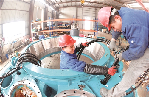 泉山經(jīng)濟(jì)開發(fā)區(qū),徐州盾安重工機(jī)械制造有限公司,工人安裝全套管鉆機(jī)。