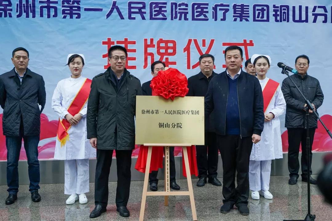 徐州市第一人民醫(yī)院院黨委書記陸仁平與銅山區(qū)政府辦公室副主任王東共同為醫(yī)療集團(tuán)銅山分院揭牌