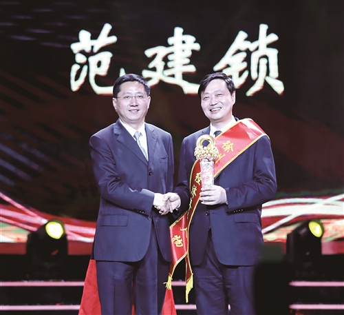 馮其譜向范建鎖頒獎(jiǎng)。
