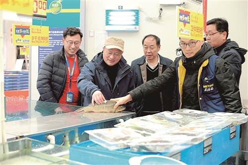 督查組成員在麥德龍超市檢查水產(chǎn)品溯源體系建設(shè)。