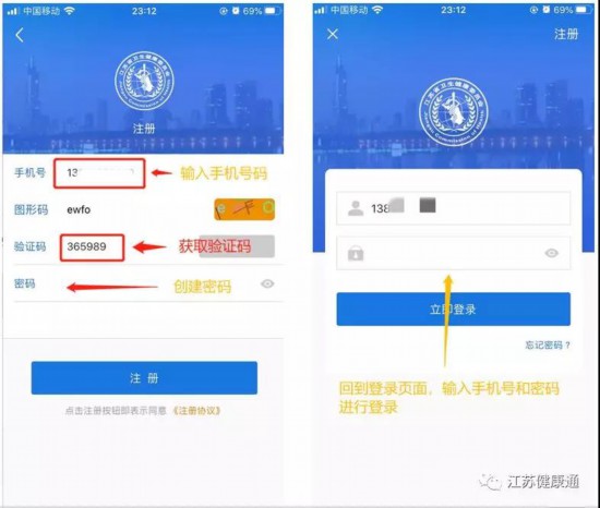 b、跳轉(zhuǎn)注冊頁面,填寫手機(jī)號、短信驗(yàn)證碼和和密碼進(jìn)行注冊,然后返回登陸界面登陸。
