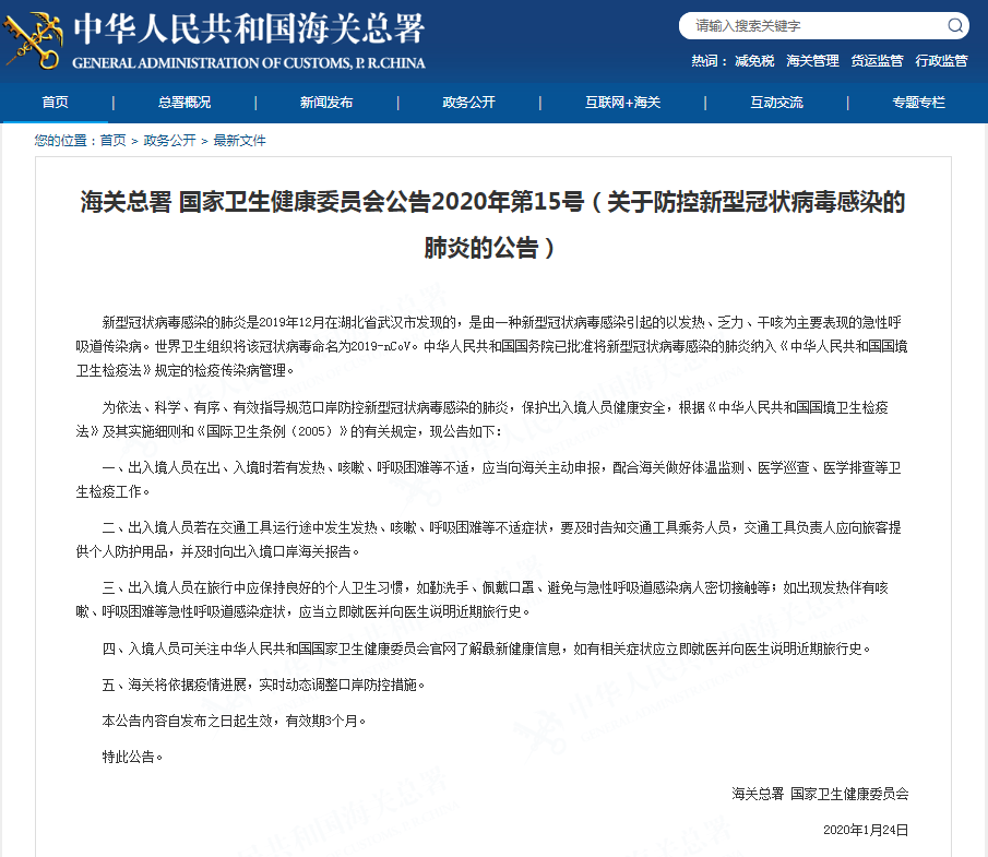 公告自2020年1月24日發(fā)布之日起生效,有效期3個月。