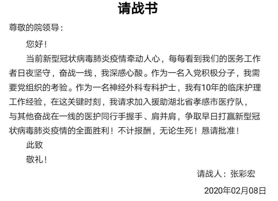 作為省專科護(hù)士,疫情一開始時(shí),張彩宏就在請(qǐng)戰(zhàn)書上按上鮮紅的指印,零時(shí),在接到參加組建援助湖北的電話后,她連夜安排好三歲的兒子,并于早晨又向黨委遞交了請(qǐng)戰(zhàn)書。