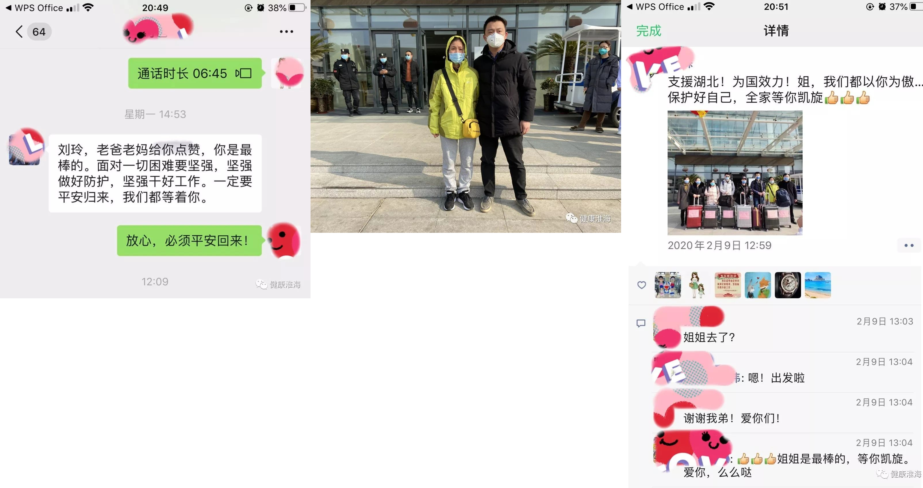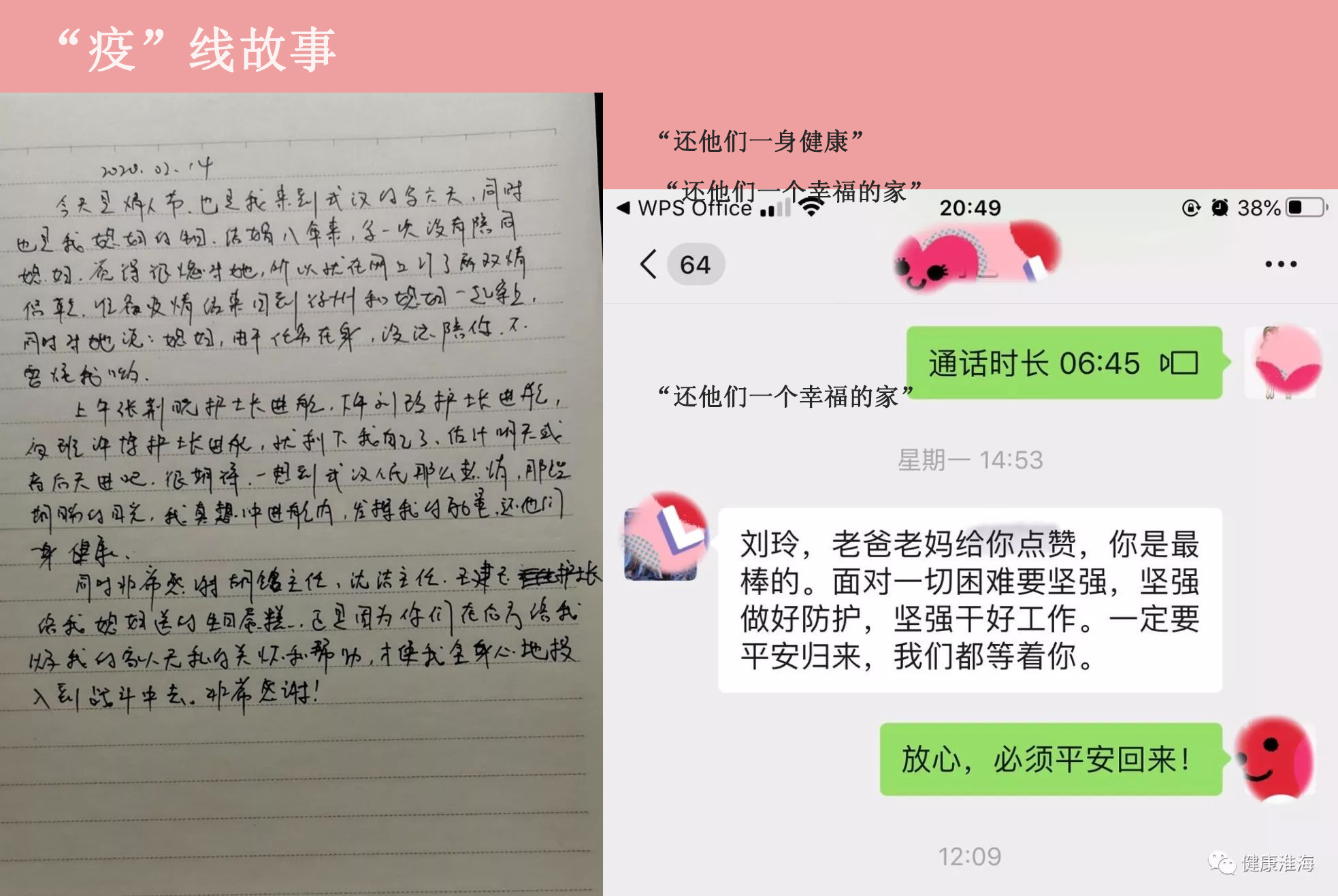 爸媽,請你們原諒我的不辭而別。雖然我去武漢的意念是堅決的,但當(dāng)我接到通知的時候,我不敢第一時間告訴你們,我怕在電話中會控制不住自己的情緒和眼淚,讓你們徒增擔(dān)憂。等下了飛機后,我才給你們發(fā)微信,而聽到你們的鼓勵,我更加堅信我的選擇沒有錯,感謝你們的支持,我會保護好自己,盡自己最大的努力幫助武漢人民渡過難關(guān),還武漢人民一個幸福的家。我爭取和同伴們早日戰(zhàn)勝疫情,平安回家,再做回你們的女兒,做回老婆和媽媽的角色,別為我掛心,請等我回家!永遠愛你們!