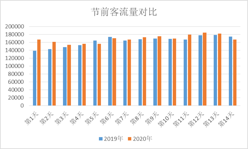 春運40天,全市總客運量最高峰值出現(xiàn)在1月21日(春運第12天),當日發(fā)送旅客18.5萬人,同比上升3.93%。