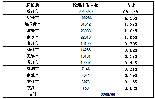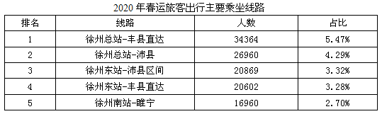 徐州發(fā)送客運量最多的5條線路依次是徐州總站-豐縣直達、徐州總站-沛縣、徐州東站-沛縣區(qū)間、徐州東站-豐縣直達、徐州南站-睢寧,這五條線路發(fā)運人數(shù)總量達到了全徐州全年發(fā)送人次的19.06%左右。