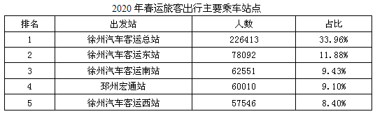 徐州發(fā)送客運量最多的5個汽車站依次是徐州汽車客運總站、徐州汽車客運東站、徐州汽車客運南站、邳州宏通站、徐州汽車客運西站,這五個汽車站發(fā)送人數(shù)總量達到了全市公路客運發(fā)送人數(shù)的72.77%左右。