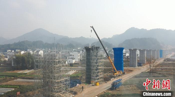 安徽省黃山市昌景黃鐵路(安徽段)休寧河大橋復(fù)工。劉盾攝