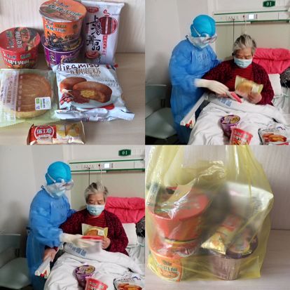 除了常規(guī)的治療工作,負(fù)責(zé)病人的飲食起居也是我們工作的一部分,今天病人吃過(guò)晚飯,我在收拾飯盒時(shí),發(fā)現(xiàn)了1床奶奶的飯幾乎沒(méi)有動(dòng),剩了許多,我就問(wèn)奶奶怎么還剩那么多飯,是哪里不舒服,不想吃嗎?奶奶無(wú)奈的搖搖頭說(shuō),不是的,我是牙齒不好,嚼不動(dòng),想吃也吃不下去啊。我聽(tīng)了既心疼又心酸,作為一個(gè)營(yíng)養(yǎng)專科護(hù)士我知道冠狀病毒肺炎這個(gè)疾病需要病人補(bǔ)充足夠的熱量,以奶奶目前的病情和體重來(lái)算,奶奶每天需要的熱量大概為1400kcal,而以奶奶目前的飲食量來(lái)算,攝入的熱量遠(yuǎn)遠(yuǎn)不夠她消耗的啊,連基礎(chǔ)代謝也滿足不了呢!這樣可不行,藥物再神奇,自身的營(yíng)養(yǎng)也很重要啊!我突然想起來(lái)賓館里還有我從徐州帶來(lái)的蛋黃派、歐式小面包,火腿腸、巧克力,泡面......說(shuō)句不好意思的話,因?yàn)椴恢裁磿r(shí)候能回去,這些“囤貨”我都沒(méi)舍得吃,本來(lái)是打算饞的時(shí)候吃的。但是,現(xiàn)在我想把這些都送給奶奶吃!我就問(wèn)奶奶,奶奶您喜歡吃面包、蛋黃派嗎,這個(gè)軟好咬,還有方便面能泡軟和一點(diǎn),奶奶您要不要吃?奶奶突然眼睛閃爍著興奮的光芒但是下一秒就眼神黯淡了,失望的說(shuō),想吃啊孩子,哪有啊,天天吃盒飯,也不想麻煩家人給送過(guò)來(lái),就將就吧。我就和奶奶說(shuō),奶奶我剛給您說(shuō)的這些吃的,我都有,是我從徐州帶來(lái)的,明天我拿給您吃好不好?我的話音剛落,奶奶突然興奮的像個(gè)孩子,一把握住我的手,突然又像想起了什么,快速的把手抽了回去,抱歉的說(shuō),對(duì)不起孩子,別傳染你了。你離我遠(yuǎn)點(diǎn),別和我那么近說(shuō)話!瞬間淚奔了,多善良的奶奶啊。