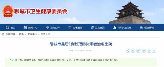 3月1日下午,聊城市最后1例新冠肺炎患者治愈出院,至此,聊城市38例新冠肺炎確診病例全部治愈出院。