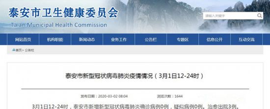 3月1日12-24時,泰安市新增新型冠狀病毒肺炎確診病例0例,疑似病例0例。治愈出院3例。