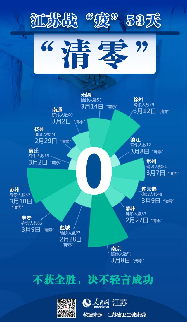 人民網(wǎng)南京3月15日電  (張妍)江蘇在院確診病例“清零”!3月15日,江蘇省衛(wèi)生健康委發(fā)布通報(bào),3月14日0-24時(shí),江蘇省無新增新型冠狀病毒肺炎確診病例,新增出院病例1例。這意味著,截至3月14日24時(shí),江蘇在院確診病例已全部出院。