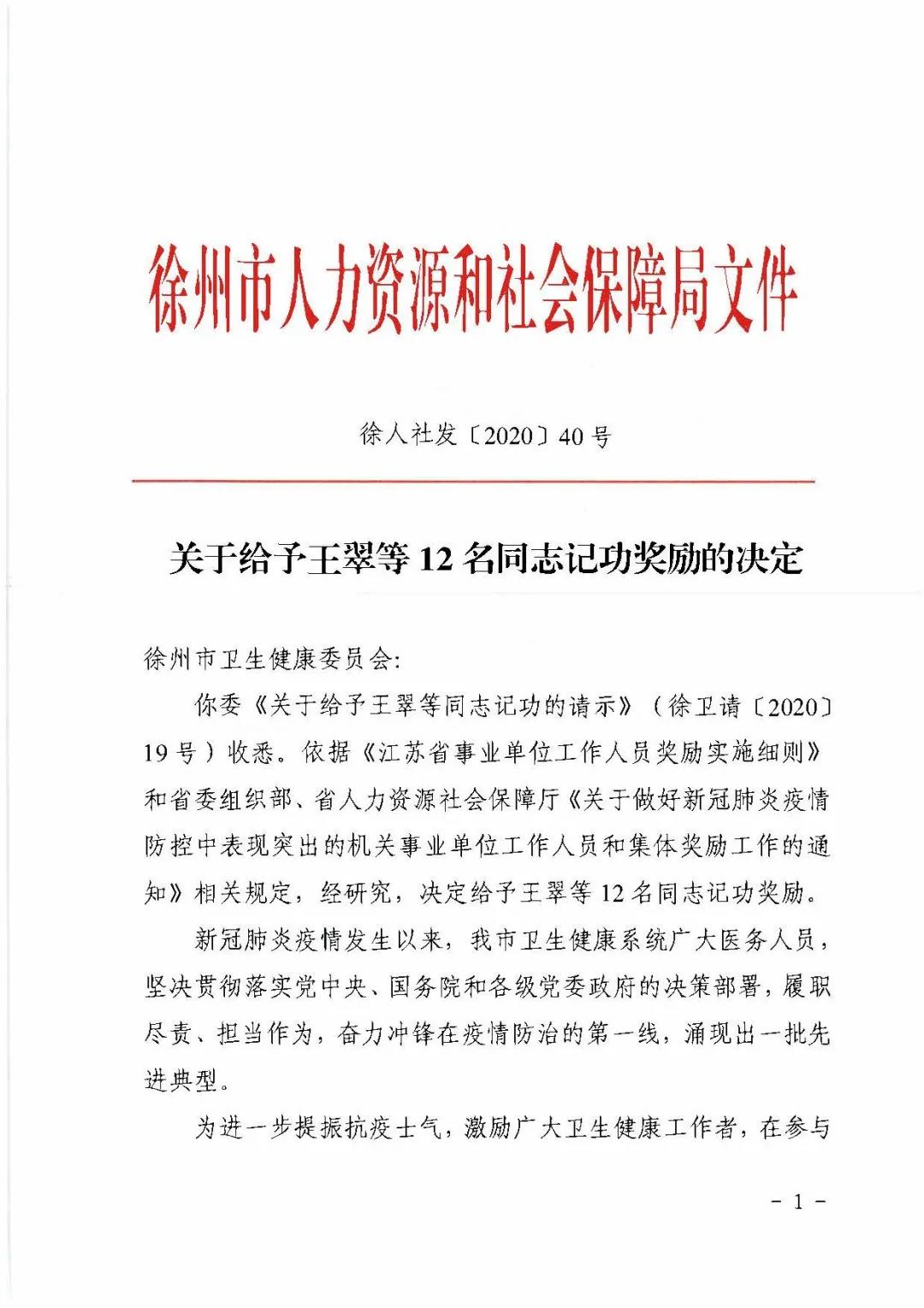 近日,徐州市人社局對(duì)我市12名參與疫情防控醫(yī)務(wù)人員給予記功獎(jiǎng)勵(lì)。徐州市新型冠狀病毒肺炎防治專家組副組長(zhǎng)、徐州市第一人民醫(yī)院大內(nèi)科主任劉向群上榜新冠肺炎疫情防控記功獎(jiǎng)勵(lì)名單。