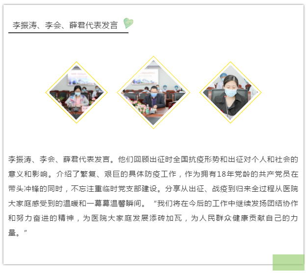 “9位同志盡管沒去武漢,但是在工作量和工作難度上不亞于武漢。雖然科室和院里盡最大努力給予你們強(qiáng)有力的支撐,幫助你們解除后顧之憂,但相較你們對全社會的貢獻(xiàn)卻是微不足道的。我一直強(qiáng)調(diào),在重大災(zāi)難面前能挺身而出的人一定都是英雄,是我們乃至全社會學(xué)習(xí)的榜樣。疫情防控期間,全社會對醫(yī)務(wù)人員和醫(yī)療系統(tǒng)的整體評價大都基于你們的行動。希望你們回來后,用你們的精神繼續(xù)影響感召全院醫(yī)務(wù)人員,共同把我們的醫(yī)院建設(shè)好,為社會做出更大貢獻(xiàn)。”