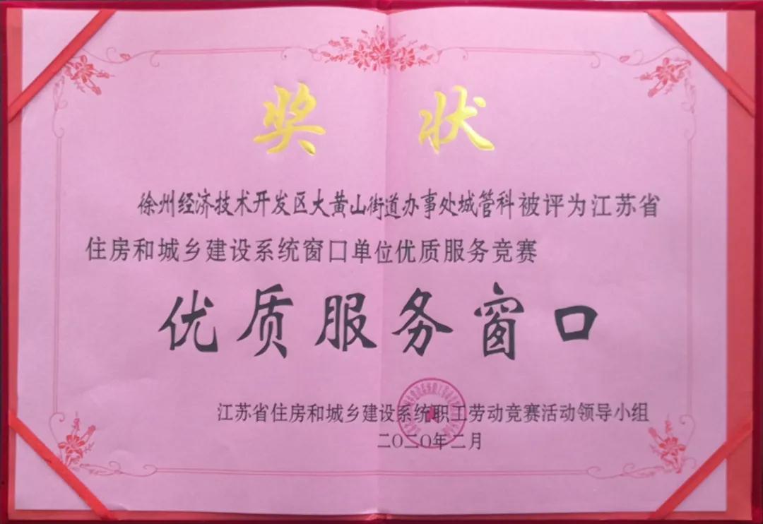 近日,大黃山街道城管中隊(duì)辦公室收到了一份沉甸甸的獎(jiǎng)?wù),這是2019年度“江蘇省住房和城鄉(xiāng)建設(shè)系統(tǒng)窗口單位優(yōu)質(zhì)服務(wù)競賽”活動(dòng)組委會(huì),授予大黃山街道城管科2019年度省級(jí)“優(yōu)質(zhì)服務(wù)窗口”榮譽(yù)稱號(hào)。