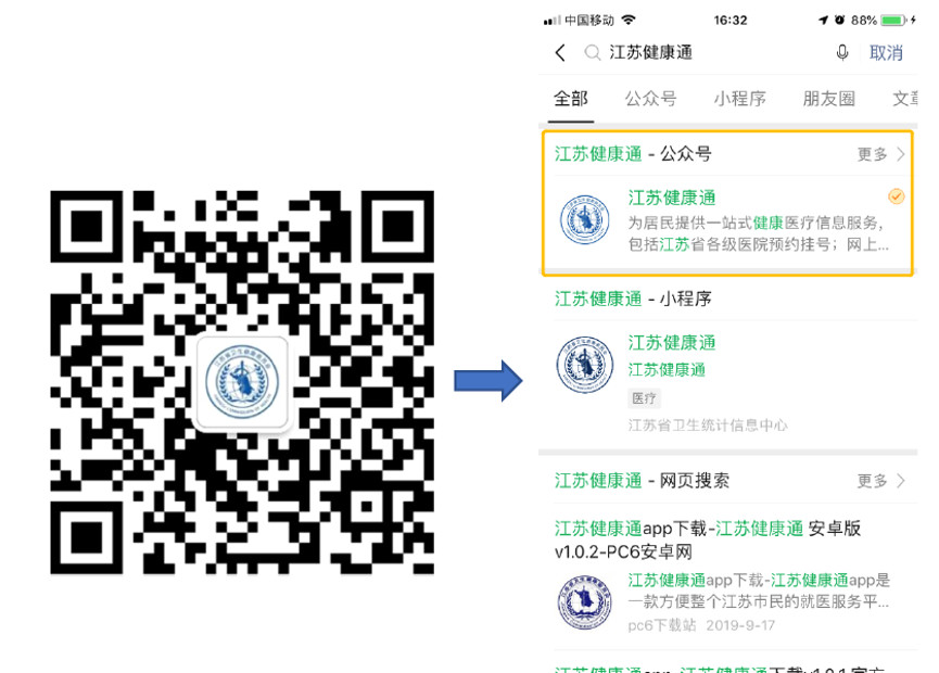掃描二維碼,或者搜索微信公眾號(hào)“江蘇健康通”進(jìn)行關(guān)注。