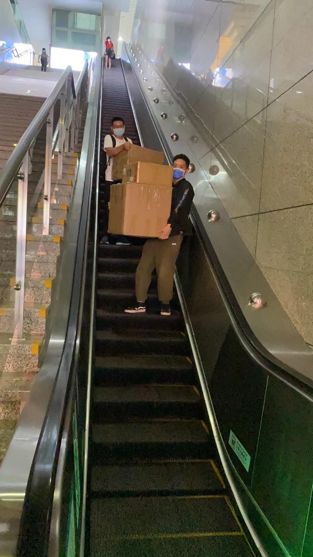 余漢忠和王子琪在機(jī)場(chǎng)搬運(yùn)物資▲