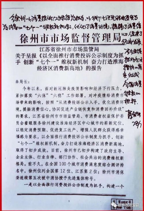 黃淮網(wǎng)(費(fèi)堅真 徐仕評) 7月28日,國家市場監(jiān)管總局副局長秦宜智就徐州創(chuàng)新“七個一”維權(quán)新機(jī)制、奮力打造淮海經(jīng)濟(jì)區(qū)消費(fèi)新高地方面的新舉措作出批示:徐州以消費(fèi)投訴公示制度為抓手,以線下七天無理由退貨等為內(nèi)容的“七個一”維權(quán)新機(jī)制,優(yōu)化了消費(fèi)環(huán)境,提振了消費(fèi)信心,促進(jìn)了經(jīng)濟(jì)發(fā)展。望繼續(xù)抓好各項措施的落實,做成全國消費(fèi)維權(quán)的標(biāo)桿。