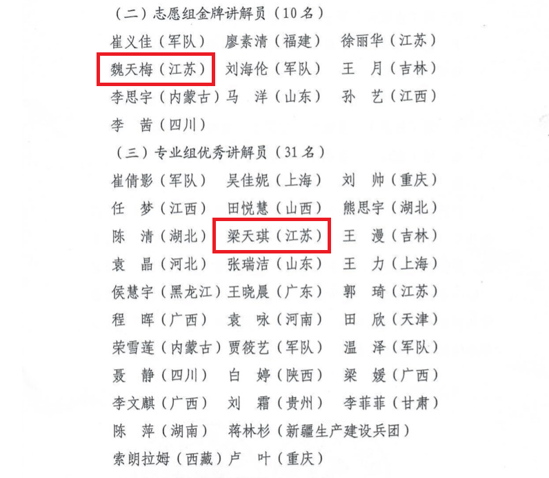 大賽期間,淮海戰(zhàn)役紀(jì)念館在省、市宣傳部門和文旅部門的指導(dǎo)下,積極組織開展培訓(xùn)選拔,推薦優(yōu)秀講解員參賽;春(zhàn)役紀(jì)念館志愿者講解員魏天梅最終成為全國志愿組前10名進(jìn)入決賽的選手之一,獲得“志愿組金牌講解員”稱號(hào),專業(yè)講解員梁天琪最終成為全國專業(yè)組前40名進(jìn)入決賽的選手之一,獲得“專業(yè)組優(yōu)秀講解員”稱號(hào)。