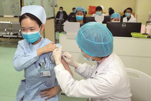 昨日,江蘇省腫瘤醫(yī)院部分一線醫(yī)務(wù)人員在南京市玄武門社區(qū)衛(wèi)生服務(wù)中心接種新冠病毒疫苗。現(xiàn)階段接種對(duì)象主要是十八至五十九歲的新冠肺炎感染高風(fēng)險(xiǎn)人群和保障社會(huì)基本運(yùn)行的關(guān)鍵崗位人員。 本報(bào)記者 陳儼 攝