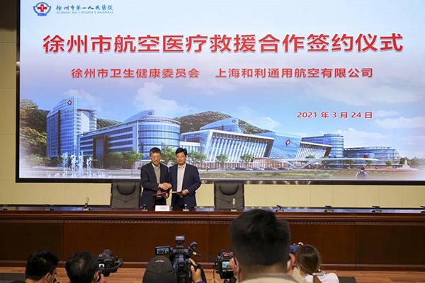 張彌雷和賀小玉分別代表徐州市衛(wèi)生健康委、上海和利通用航空有限公司簽署合作協(xié)議。合作協(xié)議的簽訂,標志著徐州市緊急醫(yī)療救援工作邁上新臺階。簽約儀式上,徐州市一院成為“徐州市航空醫(yī)學救援基地醫(yī)院”。