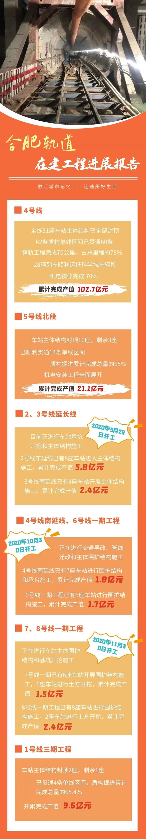 據(jù)合肥軌道交通微信號(hào)消息:目前,合肥市共有1號(hào)線三期、2號(hào)線東延線、3號(hào)線南延線、4號(hào)線和4號(hào)線南延線、5號(hào)線北段、6、7、8號(hào)線一期工程等9條線路同步在建,建設(shè)里程170.89公里。具體進(jìn)展如下: